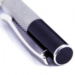 Un bolígrafo de tal nivel merece ser presentado en la caja acolchada en el exterior y forrada en el interior con el logotipo en color plata que tiene. El mismo destaca por su logotipo de la marca grabado en la parte superior del clip, por su capuchón giratorio para regular el avance de la mina y, sobre todo, por tener un depósito y capuchón grabado de plástico azul mate con acabados de color metal y clip con acabado cromo brillo.