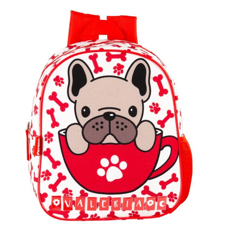 Incluye: 1 mochila de guardería de color blanca y roja con diseño de perrito con huesos y huellas, espacio principal con cierre de cremallera, forro interior de protección, bolsillo lateral de malla para botellas, asas acolchadas y ajustables, espalda acolchada, asa de mano en la parte superior, tarjeta de identificación personal y 6 abecedarios de cartón para personalizar la mochila gracias a los bolsillos delanteros de pvc.