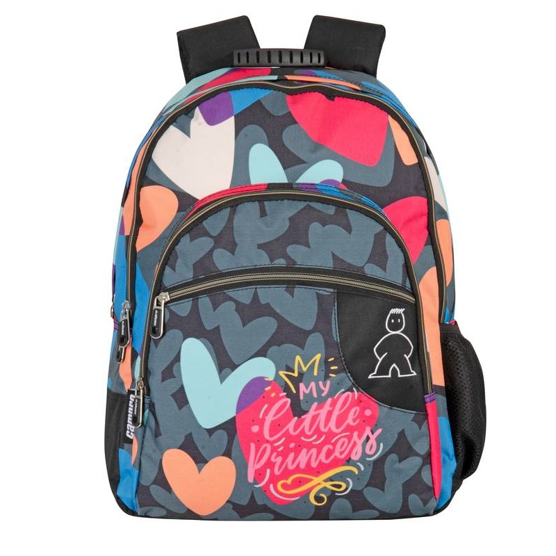 Incluye: 1 mochila doble de color gris con diseño My Little Princess con corazones de colores, sistema adaptable a carro oculto, logo bordado, asas ajustables, transpirables y acolchadas, respaldo con doble acolchado, forro interior protector, cintas reflectantes en los tirantes, base con doble refuerzo para protección, asa de mano de pvc en la parte superior, dos espacios con cierre de cremallera y bolsillo frontal con dos espacios, tiradores especiales y bolsillo lateral de malla para la botella.