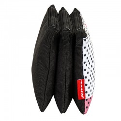 Incluye: 1 portatodo de color blanco, negro y rosa con lunares negros y un diseño especial de un bebé panda con grandes ojos, tres compartimentos separados por cremalleras, forro interior y tirador en cursor.